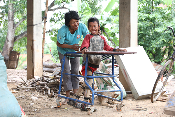 足に障がいのある男の子に補装具を提供。障がい児や家族と時間をかけて対話し、ともに解決策を見つけていきます(2019年、カンボジア) © 川畑嘉文