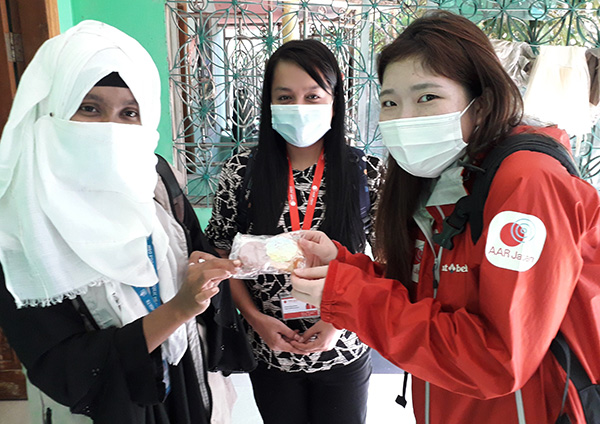 現地協力団体の衛生啓発ボランティアのシンジャハーンさん(左)に手作り石けんを渡す駐在員の町村美紗(右)。中央はAAR現地職員のダムラ(2020年11月25日)