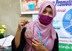 手作り石けんを受け取った現地協力団体の衛生啓発ボランティアのサミラさん(2020年11月25日)