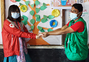 フレンドリースペースの男性ボランティアに石けんを配るAAR現地職員のサンジュクタ(左、2020年11月22日)
