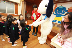 福島県郡山市のたちばな幼稚園でイベントを開催。放射能の影響で、震災以来子どもたちが屋外で遊んだのはわずか5回という。中央奥は難民を助ける会の伊藤美洋(2012年2月23日)