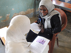 よりよい教材を作るため、活動地域の少女に試作品の感想を聞くスーダン人スタッフのサナ(右)